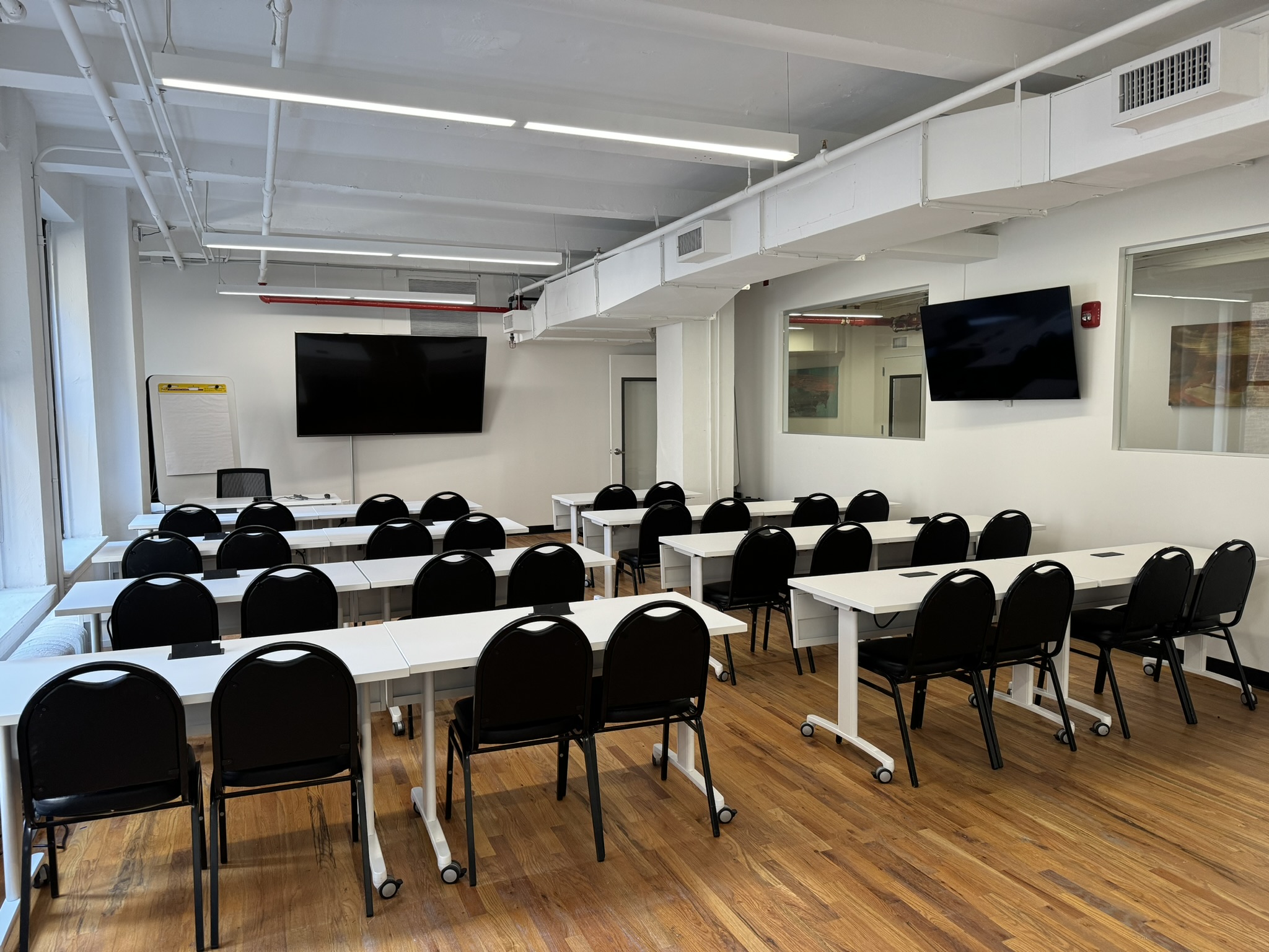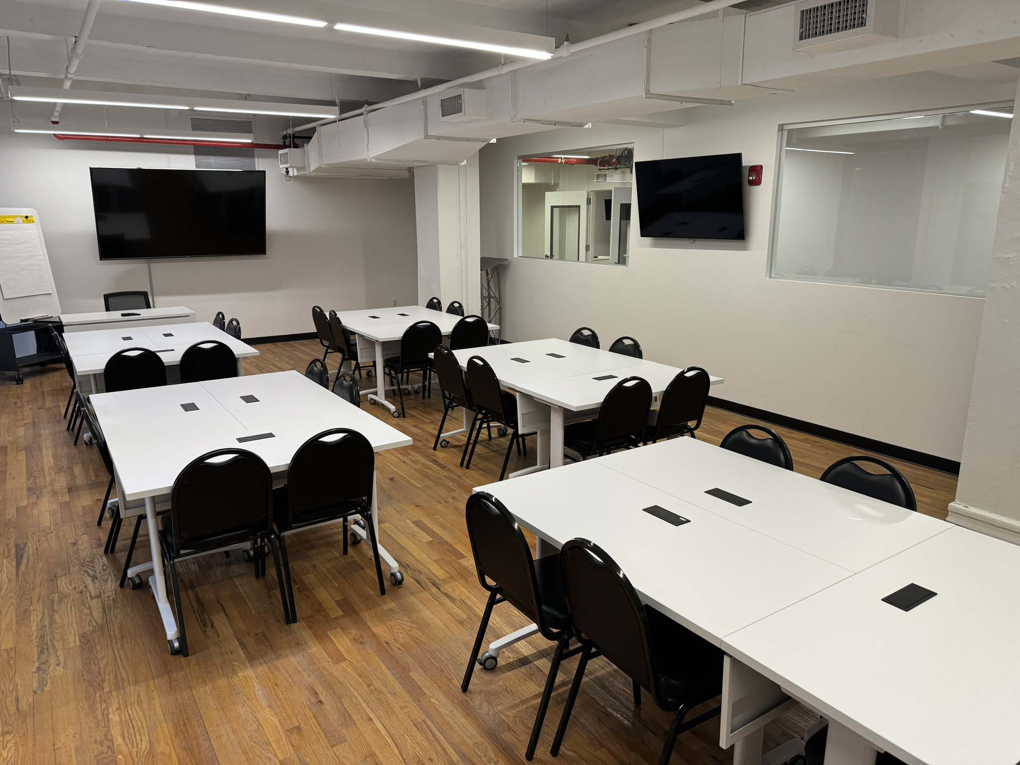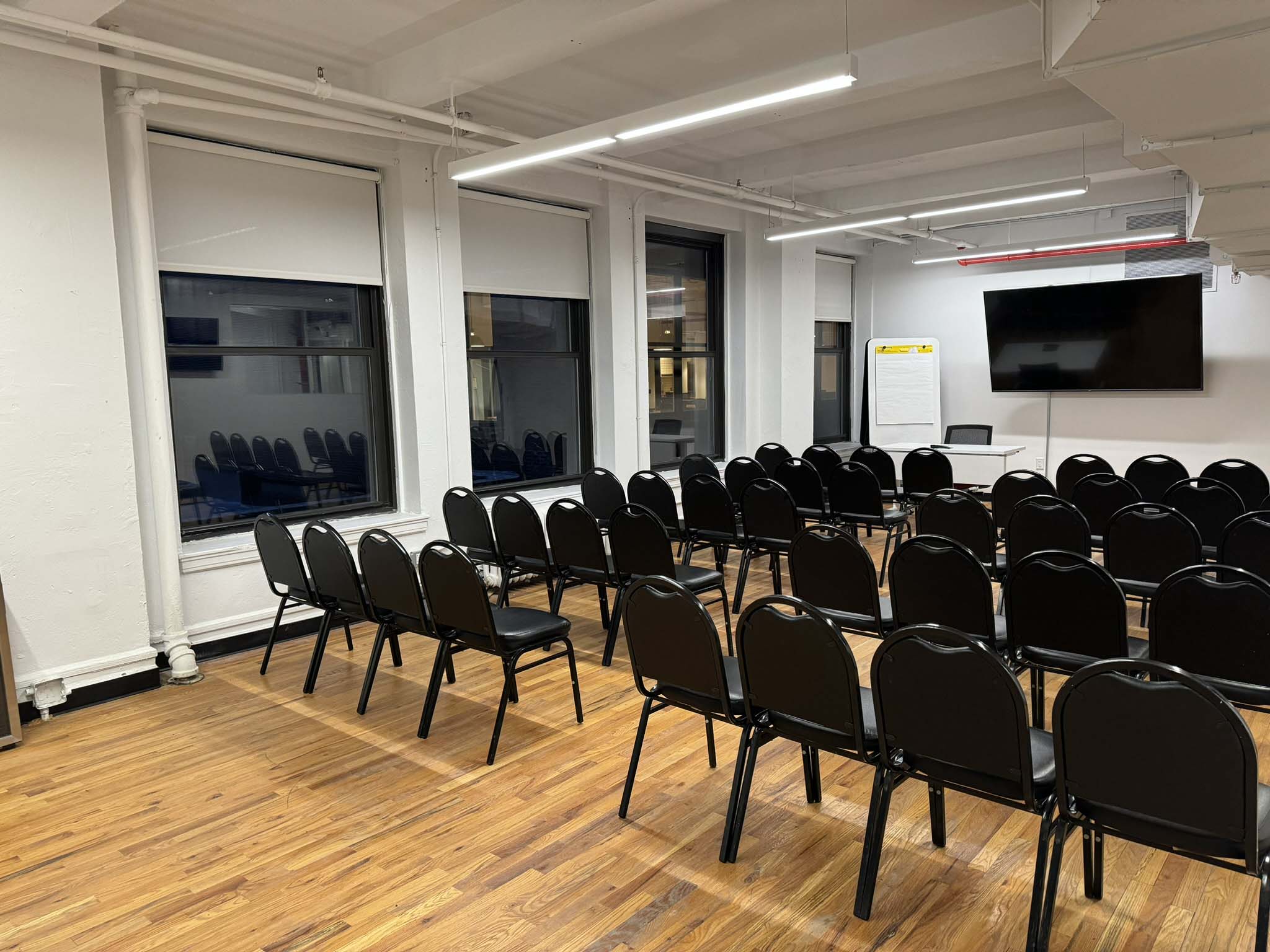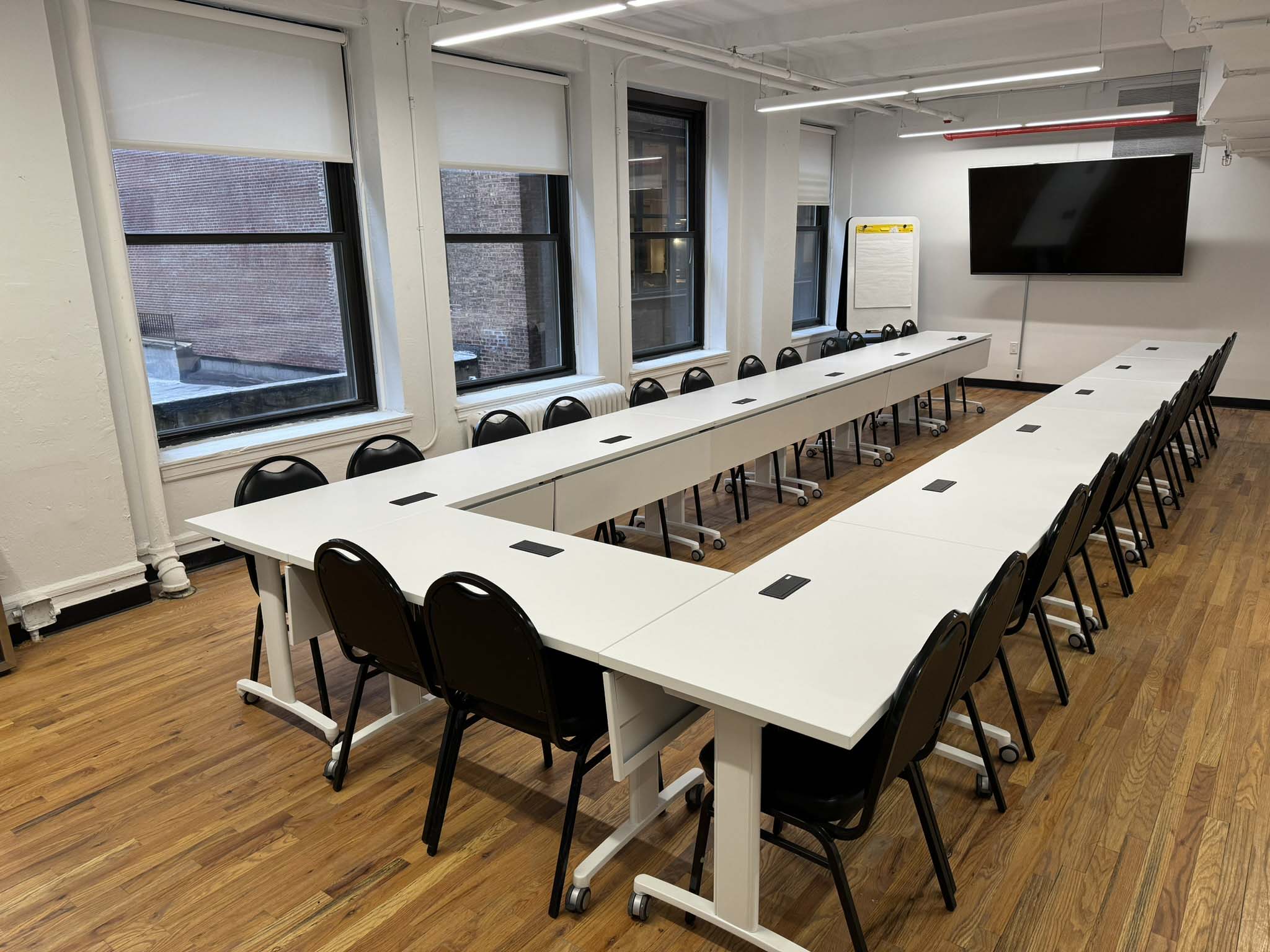 If you are looking for a mid-sized room that is ideal for training sessions, corporate get-togethers, retreats, brainstorming sessions, or as a breakout from the larger Event Hall just across the hallway, then Seminar Room C is a great choice. Well-lit and airy, it brings out the best for participants during every type of meeting. It is also ideal as extra dining space for keynote sessions and large corporate meetings taking place in the Event Hall, or as exhibition space related to a larger event. It makes a great space for video shoots and photography, as one can close the doors and have separation from the rest of our Conference Center. It’s one of NYCSCC’s most multifunctional and popular rooms, with access to NYCSCC’s double-wide corridor for buffet-style dining, as well as Meeting Room 2 which can function as a smaller breakout or green room for VIPs for large events. This room must be booked for the daily rate.